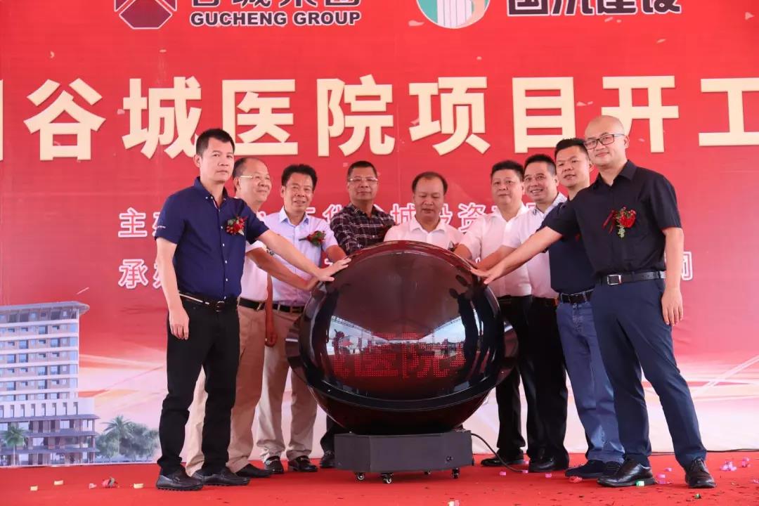 五華縣委常委劉敬東、衛(wèi)健局局長劉旭倫、谷城集團董事長賴友谷、國沅建設(shè)董事長宋國光、東升實業(yè)集團董事長賴松谷、廣超實業(yè)董事長賴超谷、廣州鴻發(fā)礦業(yè)董事長賴來谷、廣美地產(chǎn)董事長賴滿谷、中國建筑標準院總建筑師張建斌于吉時10:18分按啟動球宣布開工!