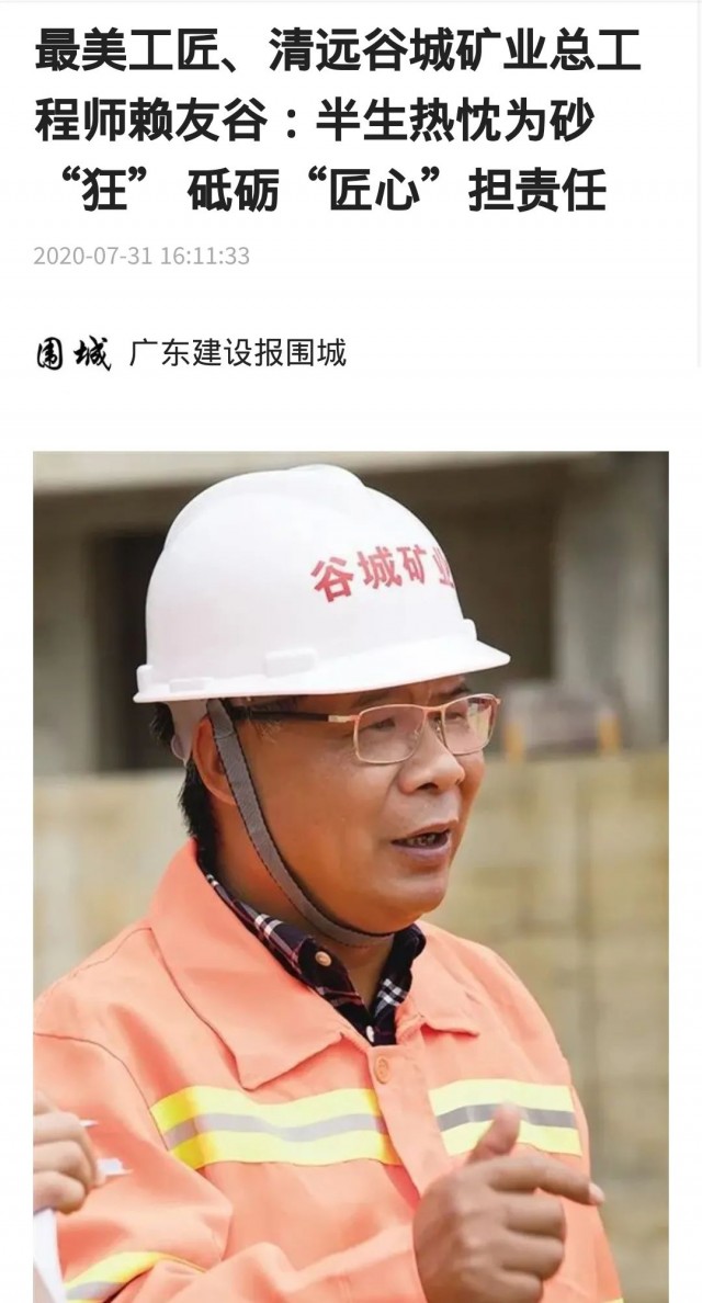 廣東建設(shè)報(bào)報(bào)道了《最美工匠、清遠(yuǎn)谷城礦業(yè)總工程師賴友谷:半生熱忱為砂“狂” 砥礪“匠心”擔(dān)責(zé)任》一文,高度夸贊了谷城集團(tuán)董事長、總工程師賴友谷在機(jī)制砂行業(yè)做出的貢獻(xiàn)。